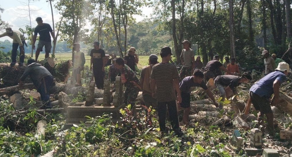 Sehingga babinsa bersama kepala desa dan masyarakat ke lokasi area perkuburan dan mengajak masyarakat setempat untuk memotong ranting dan pohon sehingga batu nisan yang tertimpa pohon bisa diangkat dan dibersihkan.