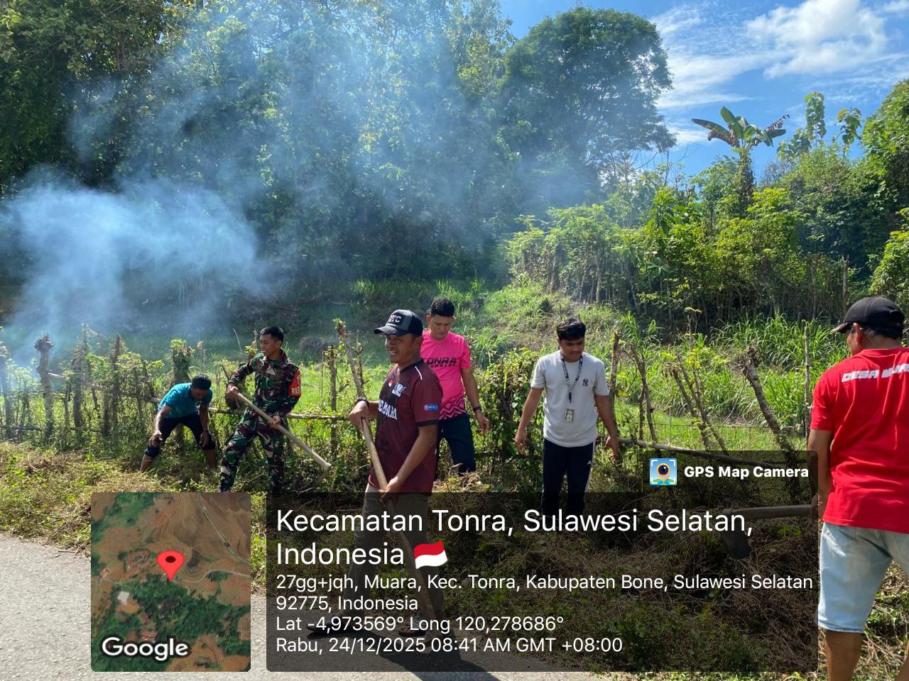Bone – Kopda Ahmad, Babinsa Koramil 1407-16/Tonra, bersama warga binaan melaksanakan kegiatan gotong royong pembersihan kanan dan kiri jalan di Dusun Bulie, Desa Muara, Kecamatan Tonra, Kabupaten Bone. Rabu (24/12/25).