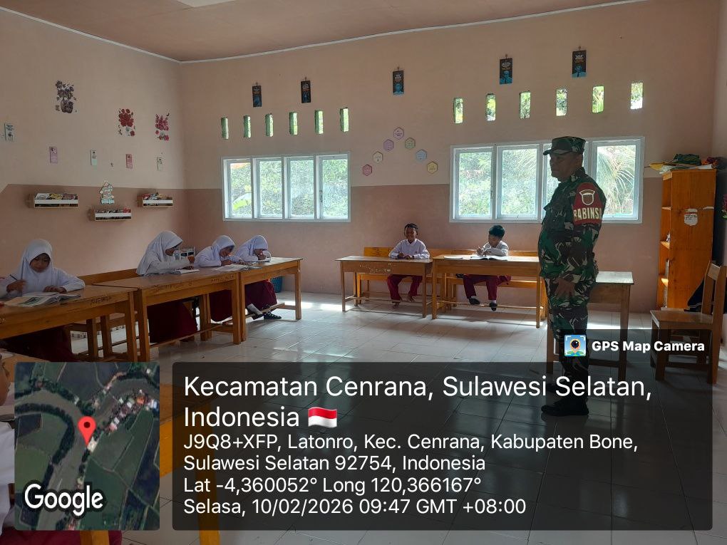 BONE – Babinsa Koramil 1407-03/Cenrana Sertu M. Yunus memberikan materi Wawasan Kebangsaan (Wasbang) kepada siswa SD Inpres 5/81 Desa Latonro, Kec. Cenrana, Kab. Bone. Selasa Siang (10/02/26).
