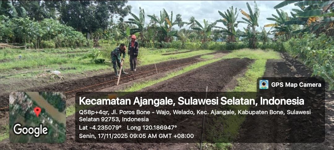 BONE – Sertu Naspa Babinsa Koramil 1407-01/Ajangale bersama warga melaksanakan pembuatan bedeng sebagai persiapan penanaman sayur-sayuran di wilayah Desa Welado, Kecamatan Ajangale, Kabupaten Bone. Senin siang (17/11/25).