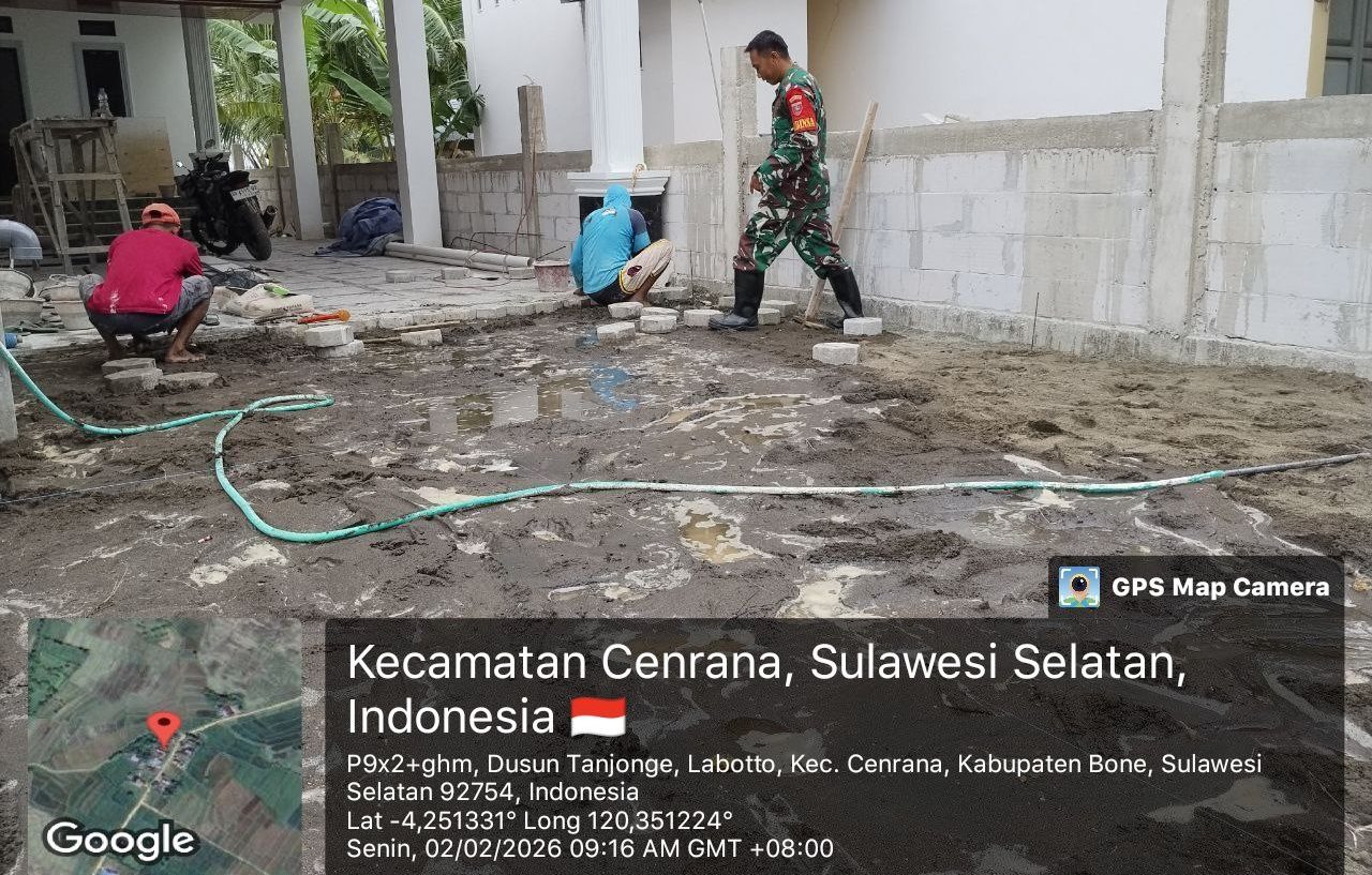 Bone — Babinsa Koramil 1407-03/Cenrana Sertu Syafaruddin melaksanakan kegiatan karya bakti membantu warga dalam pemasangan lantai rumah di Dusun Tanjonge Desa Labotto Kecamatan Cenrana Kabupaten Bone. Senin Siang (02/02/26).