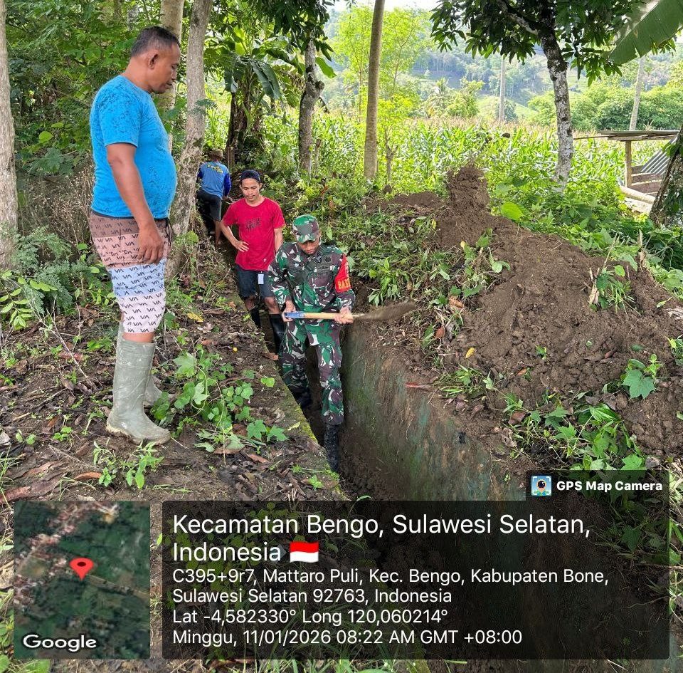 Bone — Babinsa Koramil 1407-09/Lapri, Sertu Suwardi, bersama warga melaksanakan kegiatan gotong royong membersihkan saluran air di Desa Mattaropuli, Kecamatan Bengo, Kabupaten Bone. Minggu Siang (11/01/26).
