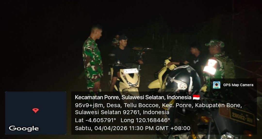 BONE – Babinsa Koramil 1407-10/Ponre Serda Darwis, melaksanakan kegiatan patroli malam di wilayah Desa Tellu Boccoe Kecamatan Ponre, Kabupaten Bone. Minggu Siang (05/04/26)