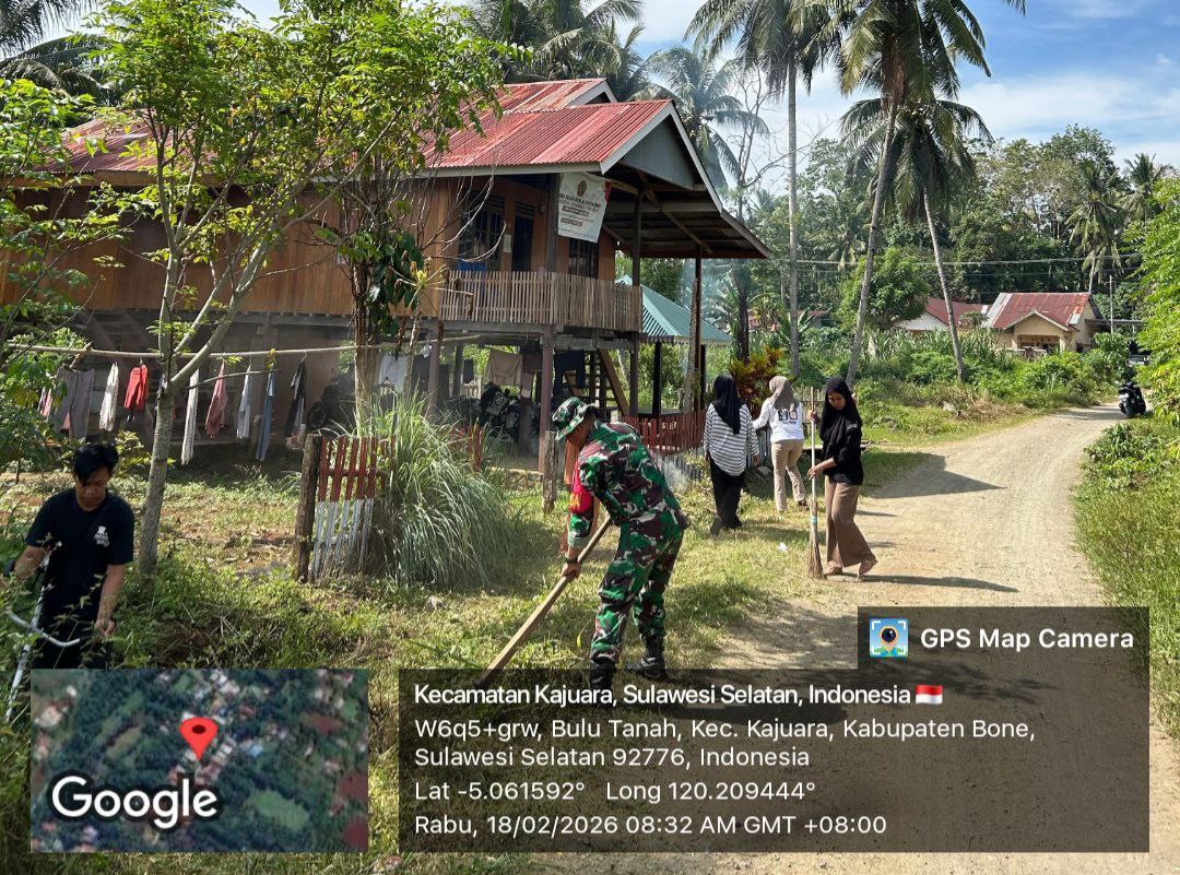BONE – Babinsa Koramil 1407-18/Kajuara, Serda Budiawan, melaksanakan kegiatan karya bakti berupa pembersihan kanan dan kiri jalan bersama warga di Desa Bulu Tanah, Kecamatan Kajuara, Kabupaten Bone, Rabu Siang (18/02/26).