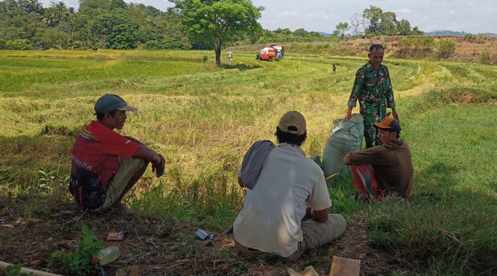 Bone – Babinsa Koramil 1407-17/Salomekko Sertu Herman melakukan pendampingan kepada petani saat istirahat panen padi di Kel. Pancaitanah, Kec. Salomekko, Kab. Bone. Jumat (30/01/26).