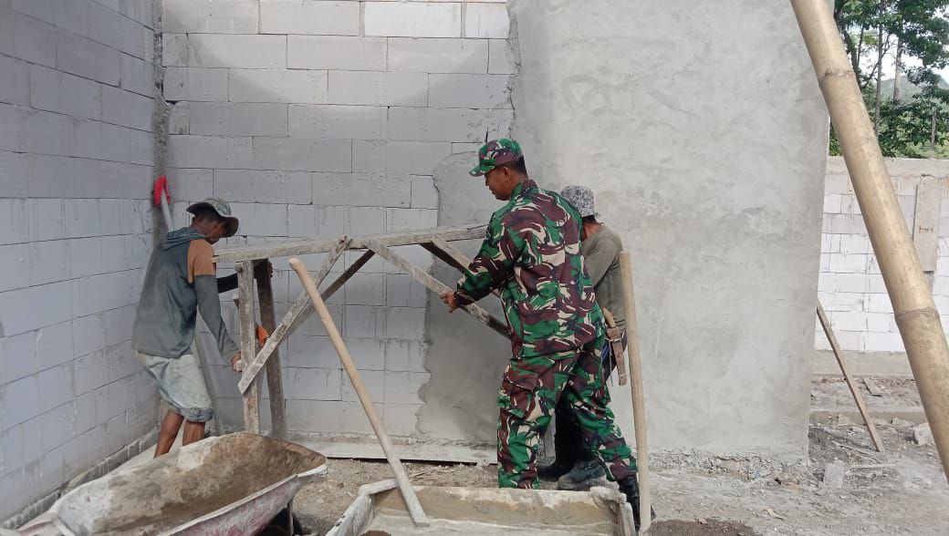 Babinsa terjun langsung ke lapangan bersama warga, membantu pekerjaan fisik seperti mengangkat dan memasang rangka bangunan.