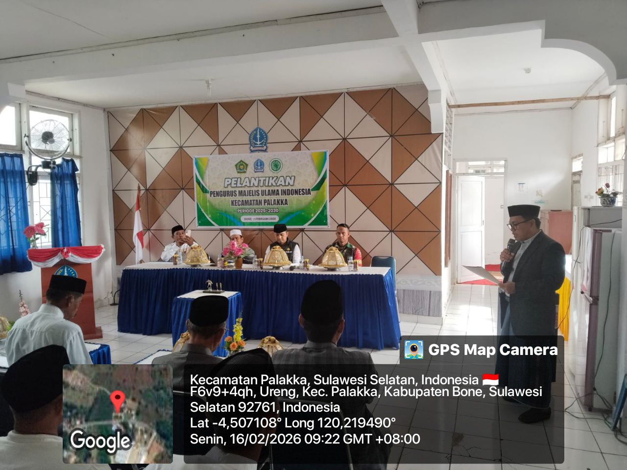 BONE – Babinsa Koramil 1407-21/Palakka Sertu Kahar hadiri pelantikan pengurus Majelis Ulama Indonesia (MUI) tingkat kecamatan yang dilaksanakan di aula kantor kecamatan,Desa Ureng,Kec. Palakka, Kab. Bone. Senin Siang (16/02/26).