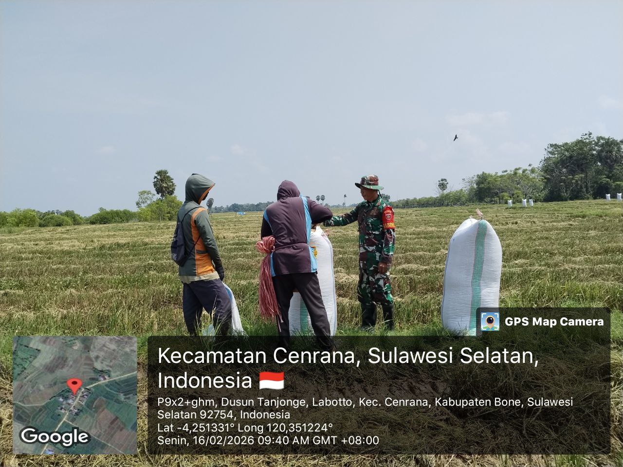 BONE – Babinsa Koramil 1407-03/Cenrana Sertu Syafaruddin melaksanakan pengawasan dan pendampingan panen padi milik petani di wilayah binaannya di Dusun Tanjonge, Desa Labotto, Kec. Cenrana, Kab. Bone. Senin Siang (16/02/26).