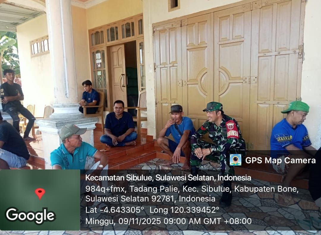 BONE – Babinsa Koramil 13/Sibulue, Kodim 1407/Bone Koptu Agus Nawang melaksanakan kegiatan Komunikasi Sosial (Komsos) dengan tokoh masyarakat dan tokoh agama bertempat di Desa Tadang Palie, Kecamatan Sibulue, Kabupaten Bone. Minggu Siang (09/11/25).