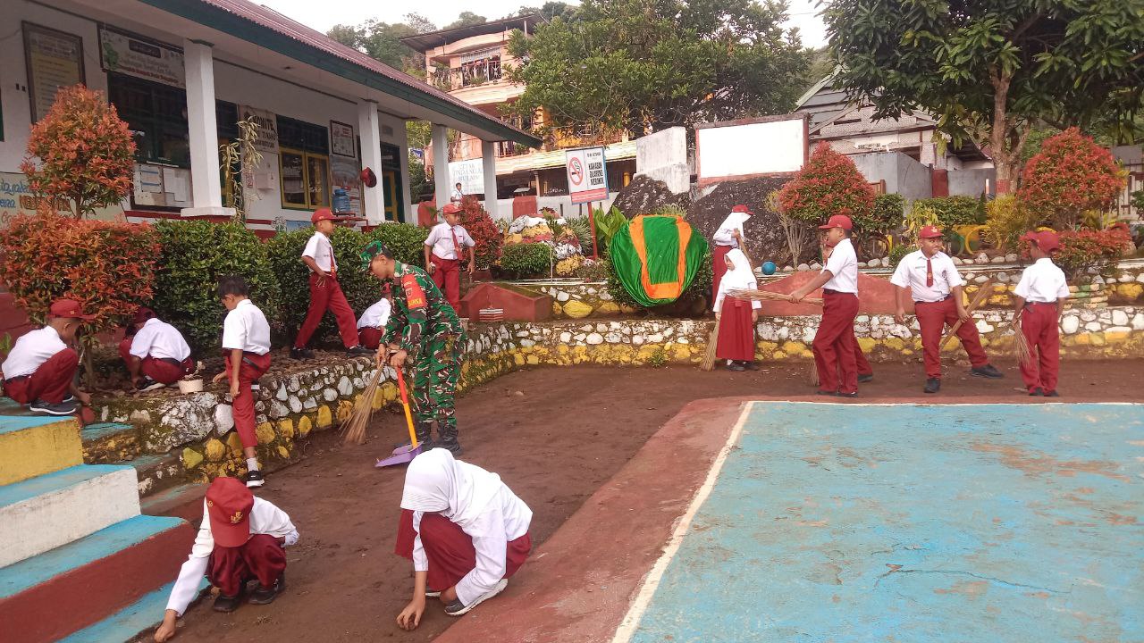 BONE – Babinsa Koramil 1407-20/Bontocani Sertu A. Riady melaksanakan bersih-bersih lingkungan sekolah bersama siswa SDN Inpres 10/73 Kahu, Kec. Bontocani, Kab. Bone. Rabu (14/01/26).