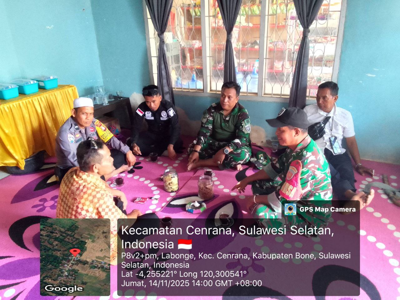 BONE – Danramil 1407-03/Cenrana, Kapten Inf Andi Aryanto Arno bersama dengan Babinsa Sertu Fadli Ragga melaksanakan Komunikasi Sosial (Komsos) di rumah Kepala Dusun IV Calodo, Desa Lebongnge, Kec. Cenrana, Kab. Bone, Jumat (14/11/25).