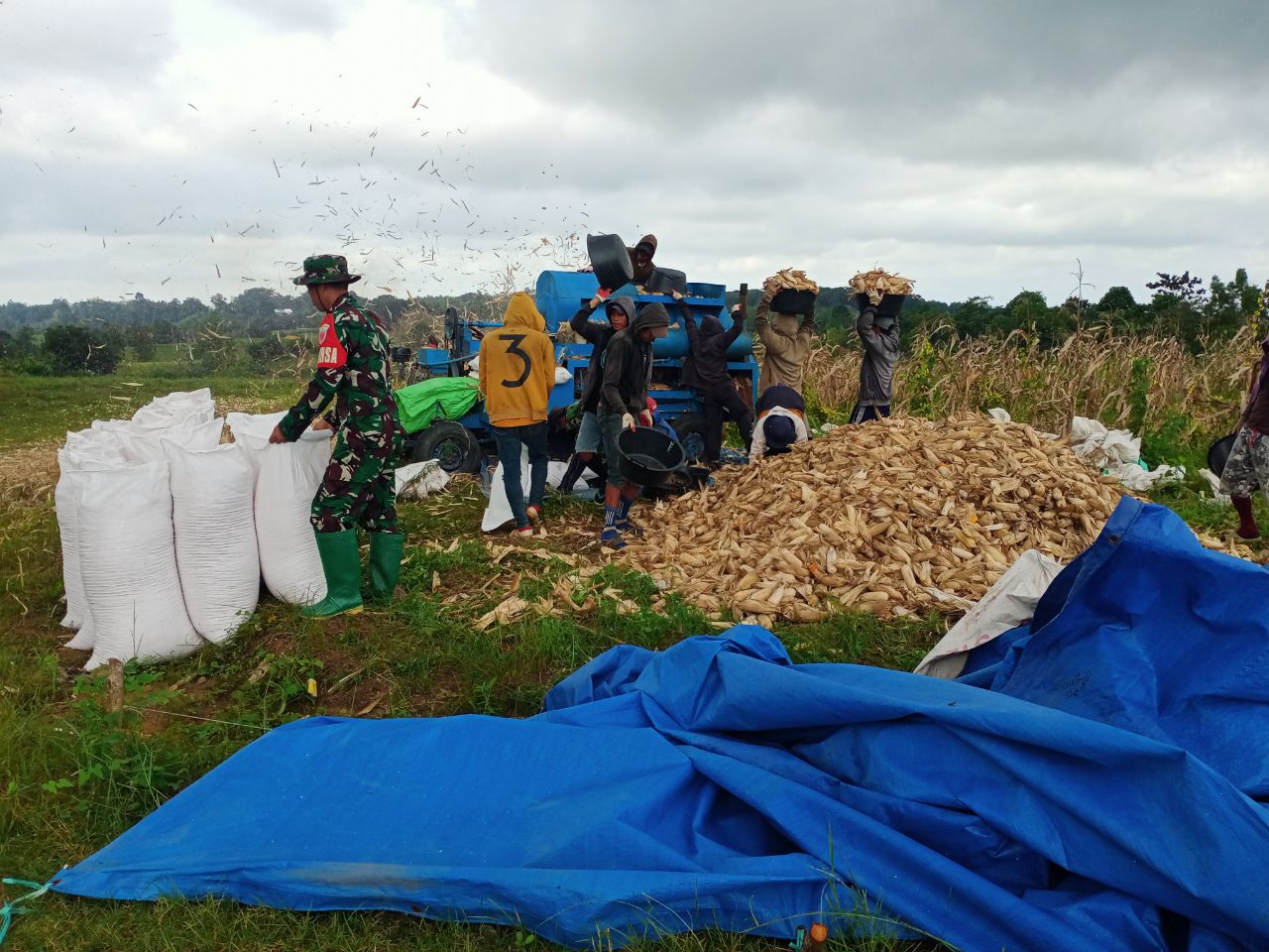 BONE – Mendukung ketahanan pangan, Babinsa Koramil 10/Ponre Kodim 1407/Bone Serda Iwan Setiawan membantu petani merontok/mengupas jagung di wilayah binaan yang berlokasi di Desa Bolli, Kec. Ponre, Kab. Bone.