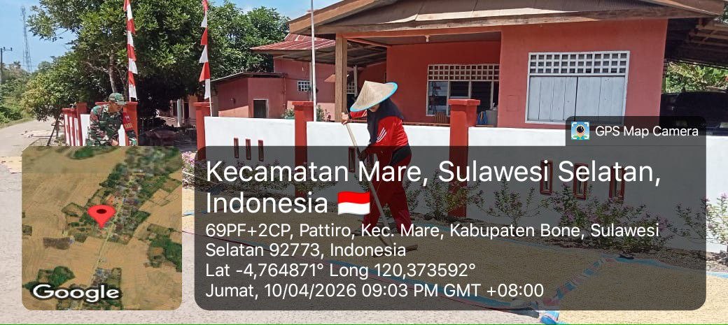 Bone – Babinsa Koramil 1407-15/Mare Kodim 1407/Bone, Koptu Tahang, turun langsung membantu proses penjemuran padi milik warga di Desa Pattiro, Kecamatan Mare, Kabupaten Bone. Jumat siang (10/04/2026).