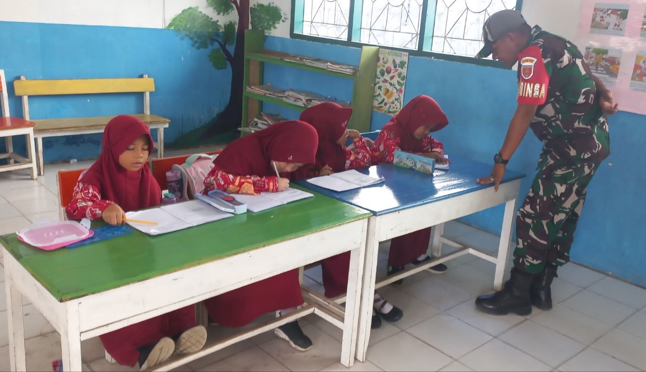 BONE – Babinsa Koramil 1407-19/Kahu Serda M. Johannis melaksanakan pemantauan proses belajar mengajar di SD Inpres 10/73, Kel. Palattae, Kec. Kahu, Kab. Bone, Kamis (09/04/26).