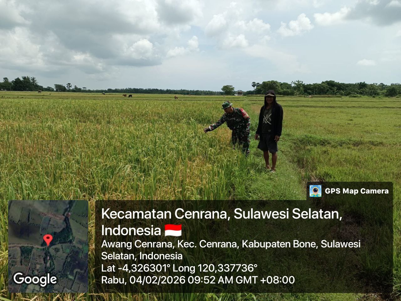 BONE – Babinsa Koramil 1407-03/Cenrana, Serda Muhammad Sabir, melaksanakan kegiatan pendampingan kepada petani dengan memantau perkembangan tanaman padi di Dusun II Dare Kalukue, Desa Awang, Kecamatan Cenrana, Kabupaten Bone. Rabu Siang (04/02/26).