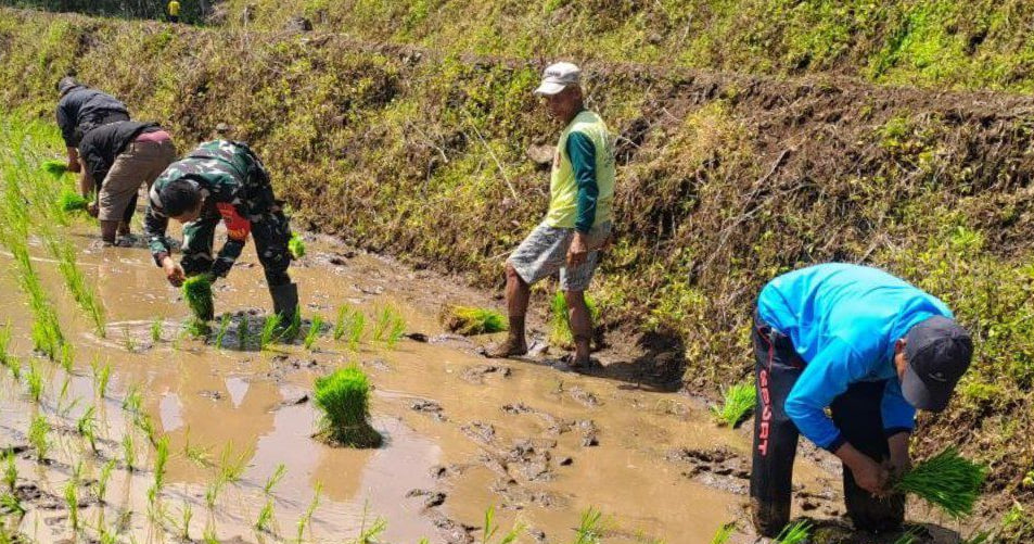 Dalam pelaksanaannya, Koptu Sudarming bersama warga turun langsung ke sawah untuk melakukan penanaman padi secara gotong royong.