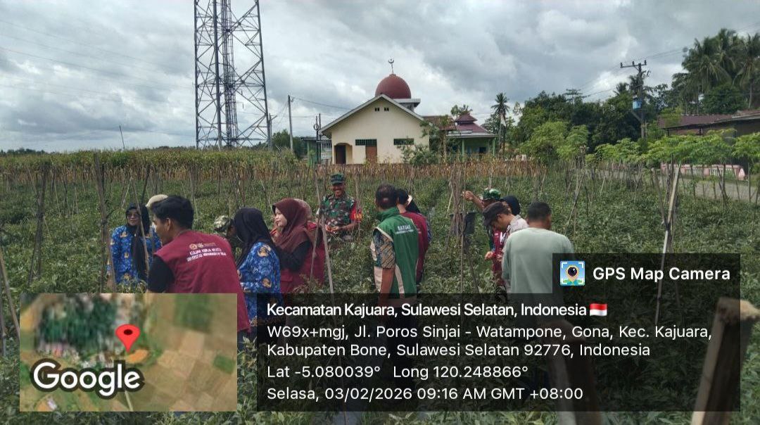 BONE – Danramil 1407-18/Kajuara Lettu Inf Syahruddin bersama Penyuluh Pertanian Lapangan (PPL) dan Kepala Desa melaksanakan panen cabe kelompok tani Andalan yang merupakan program pertanian berdana desa, bertempat di Desa Gona, Kec. Kajuara, Kab. Bone. Selasa (03/02/26).