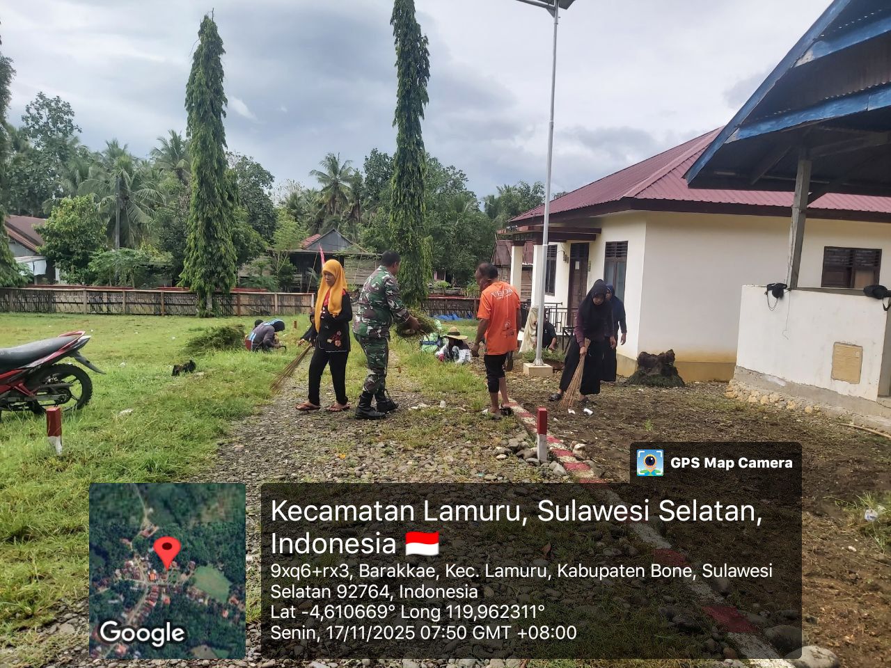BONE – Babinsa Koramil 08/Lamuru Kodim 1407/Bone, Serka Amir Hamsah, bersama pemerintah desa dan warga setempat melaksanakan kegiatan karya bakti pembersihan di seputar halaman kantor Desa Barakkae, Kecamatan Lamuru, Kabupaten Bone. Senin (17/11/2025)