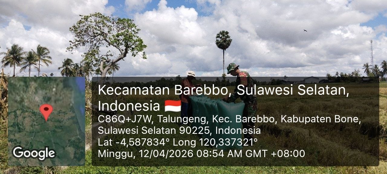 Bone – Babinsa Koramil 1407-11/Barebbo Serma Salama melaksanakan kegiatan pendampingan panen padi di wilayah desa binaannya, tepatnya di Desa Talungeng, Kecamatan Barebbo, Kab. Bone. Sabtu siang (11/04/26).