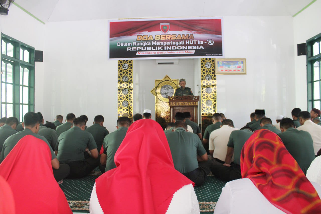 Dalam sambutannya, Letkol Inf Hastiar Hatta menyampaikan bahwa kegiatan doa bersama ini merupakan bagian dari perintah untuk memeriahkan HUT RI ke-79. “Semoga kegiatan ini berjalan dengan lancar. Mari kita memohon serta bersyukur kepada Tuhan Yang Maha Esa bahwa kemerdekaan Republik Indonesia adalah nikmat dari Allah SWT. Kemerdekaan ini merupakan anugerah yang sangat mulia, dan mari kita syukuri dengan penuh kesadaran akan makna yang mendalam dari perjuangan para pahlawan bangsa,” ujarnya.