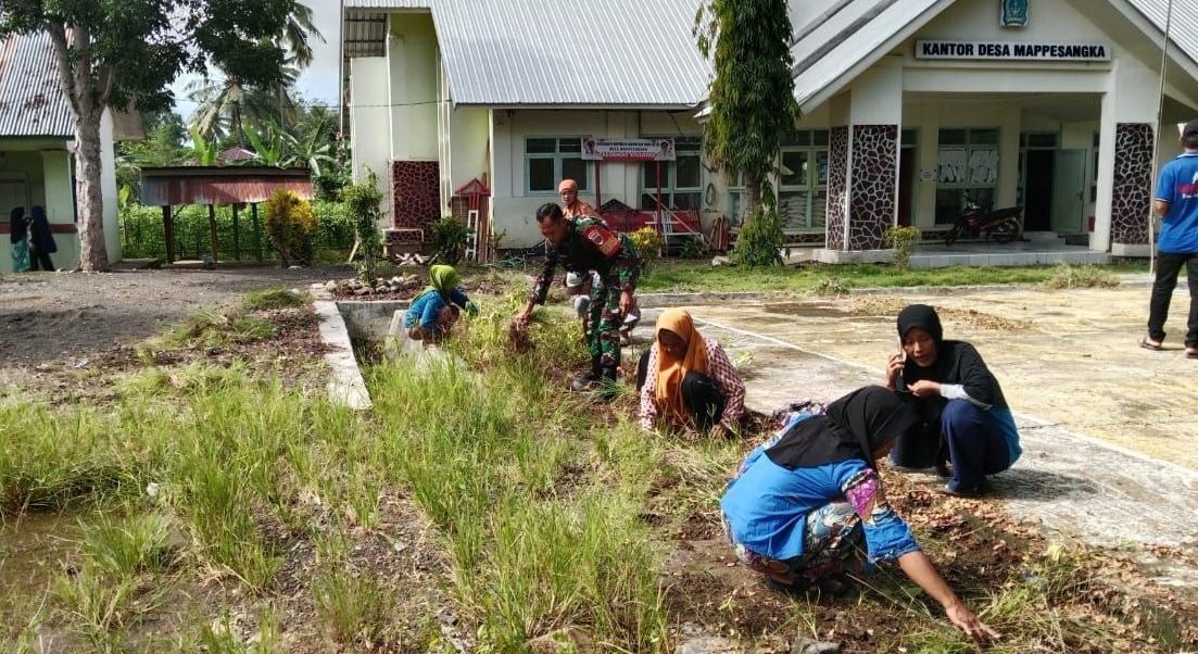 BONE – Babinsa Koramil 1407-10/Ponre Serka Darwan Sanusi melaksanakan kerja bakti bersama perangkat desa di halaman Kantor Desa desa Mappesangka, Kec. Ponre, Kab. Bone. Senin (06/04/26)