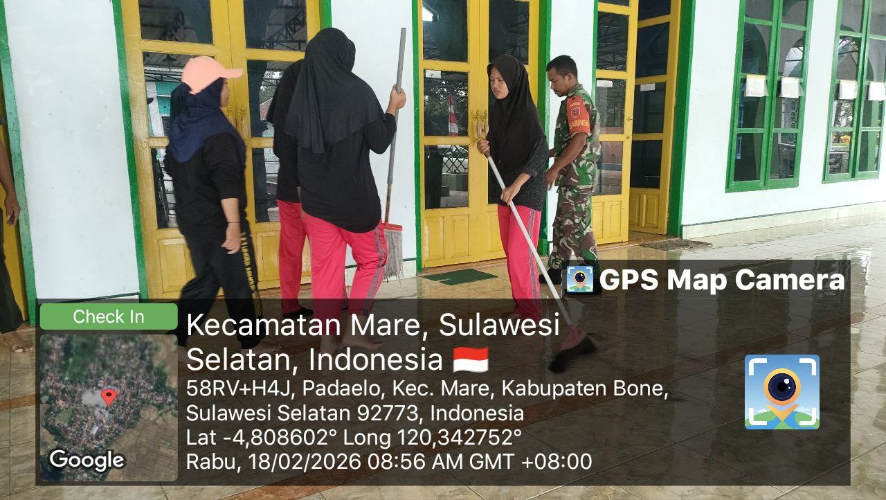 BONE – Sertu Lamuru, Babinsa Koramil 1407-15/Mare, bersama remaja masjid melaksanakan kegiatan kerja bakti pembersihan di Mesjid Al-Ikhlas, Kelurahan Padaelo, Kecamatan Mare, Kabupaten Bone. Rabu siang (18/02/26).