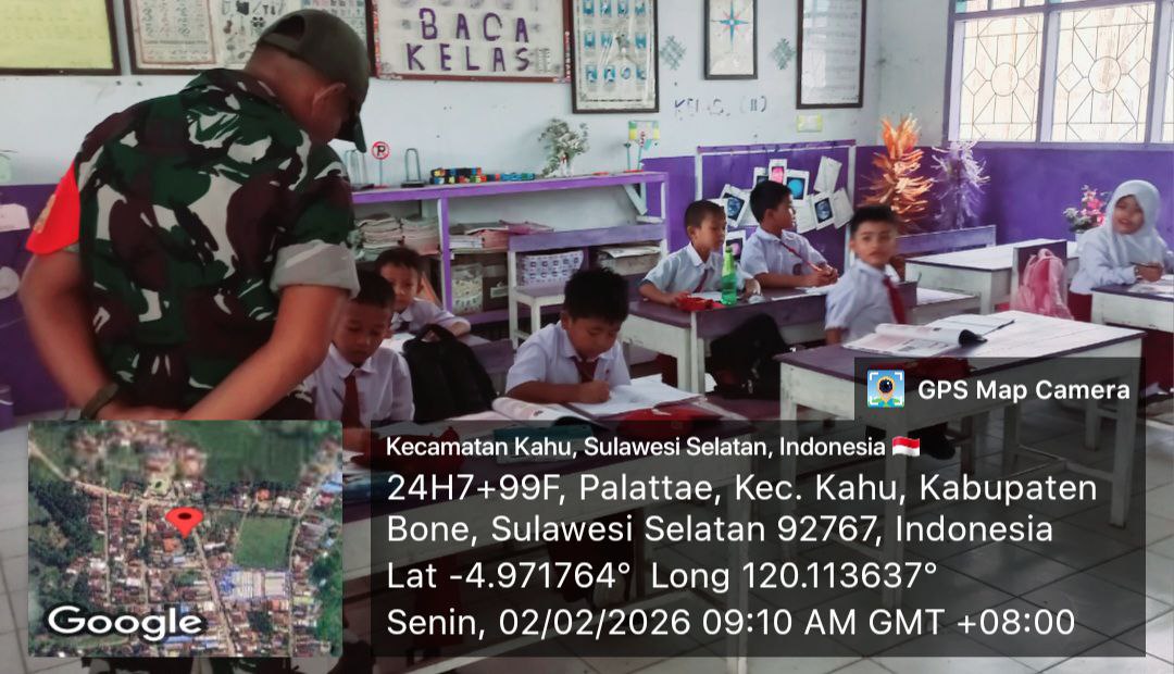 Bone – Babinsa Koramil 1407-19/Kahu Serda M. Johannis, melaksanakan pemantauan kegiatan belajar mengajar (KBM) di SDN 278 Palattae, Kelurahan Palattae, Kecamatan Kahu, Kabupaten Bone.a Senin siang (02/02/26).
