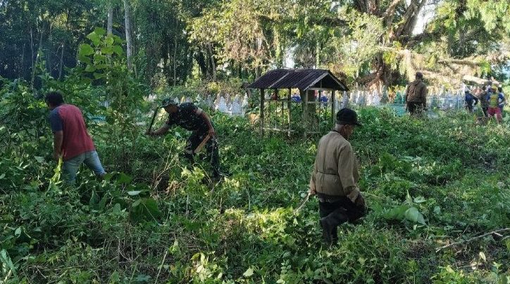 Babinsa bersama warga membersihkan area pemakaman, merapikan tumbuhan liar, serta mengangkat sampah yang ada di sekitar pemakaman.