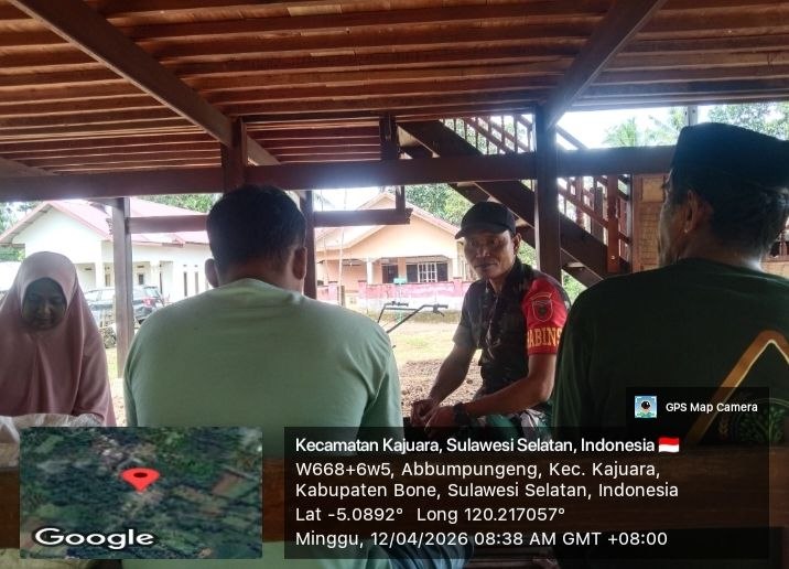 Bone – Babinsa Koramil 1407-18/Kajuara Serda Alimuddin melaksanakan komunikasi sosial (Komsos) bersama warga binaannya di Desa Abbumpungeng, Kecamatan Kajuara, Kabupaten Bone. Minggu siang (12/04/26).