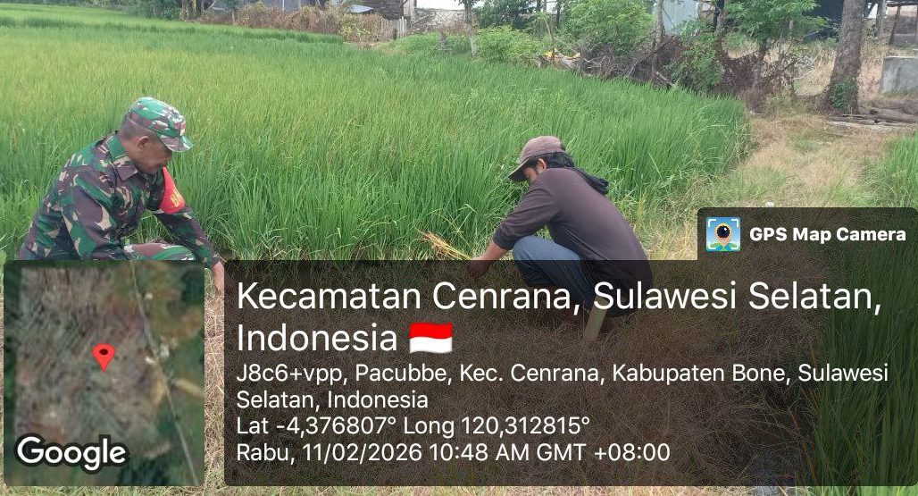 Bone – Babinsa Koramil 1407-03/Cenrana Sertu Abd. Karim dampingi Kelompok Tani (Poktan) Tadducung dalam memantau perkembangan tanaman padi di Dusun Panrokoe, Desa Pacubbe, Kec. Cenrana, Kab. Bone. Rabu siang (11/02/26).