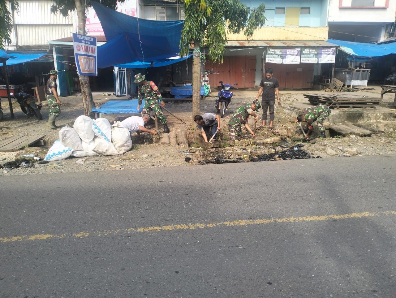 Personel Koramil bersama warga setempat bergotong royong membersihkan selokan yang sering tersumbat, sehingga dapat mengurangi potensi banjir dan menjaga kesehatan lingkungan sekitar.
