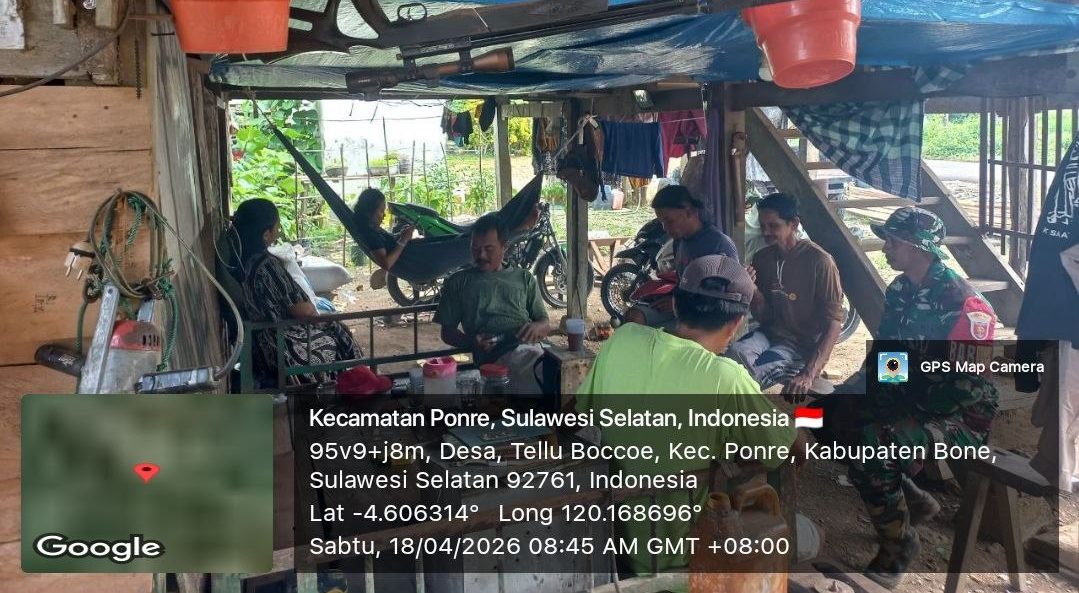 BONE – Babinsa Koramil 1407-10/Ponre Serda Darwis melaksanakan komunikasi sosial (Komsos) bersama warga binaannya di Desa Tellu Boccoe, Kecamatan Ponre, Kabupaten Bone. Sabtu siang (18/04/26).