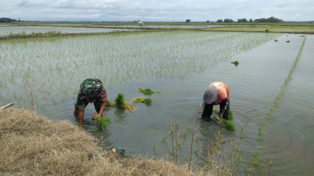 Kegiatan tersebut dilakukan bersama petani setempat dengan penuh semangat gotong royong. Kehadiran Babinsa di tengah-tengah petani bertujuan untuk memberikan motivasi serta meringankan beban kerja warga, khususnya dalam proses tanam pindah bibit padi yang membutuhkan tenaga dan ketelitian.