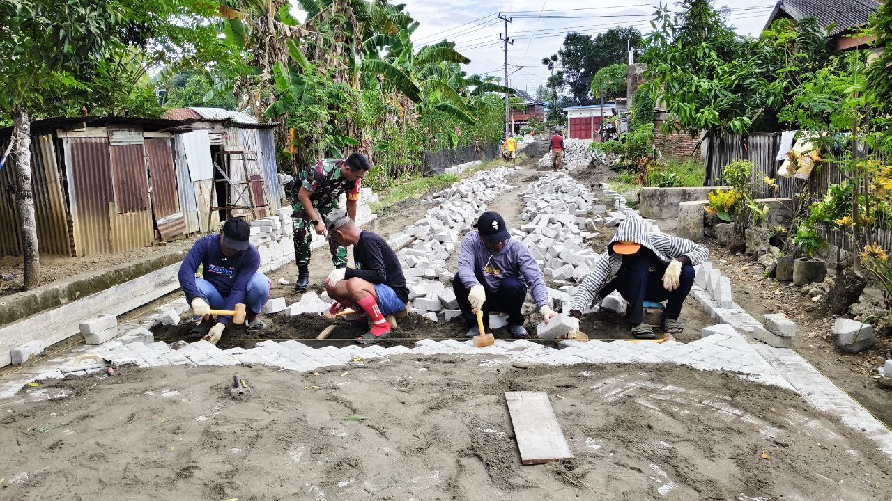 Babinsa turut serta membantu proses pemasangan paving blok mulai dari tahap persiapan lahan, perataan tanah, hingga pemasangan paving agar jalan lingkungan menjadi lebih rapi, bersih, dan nyaman dilalui warga.