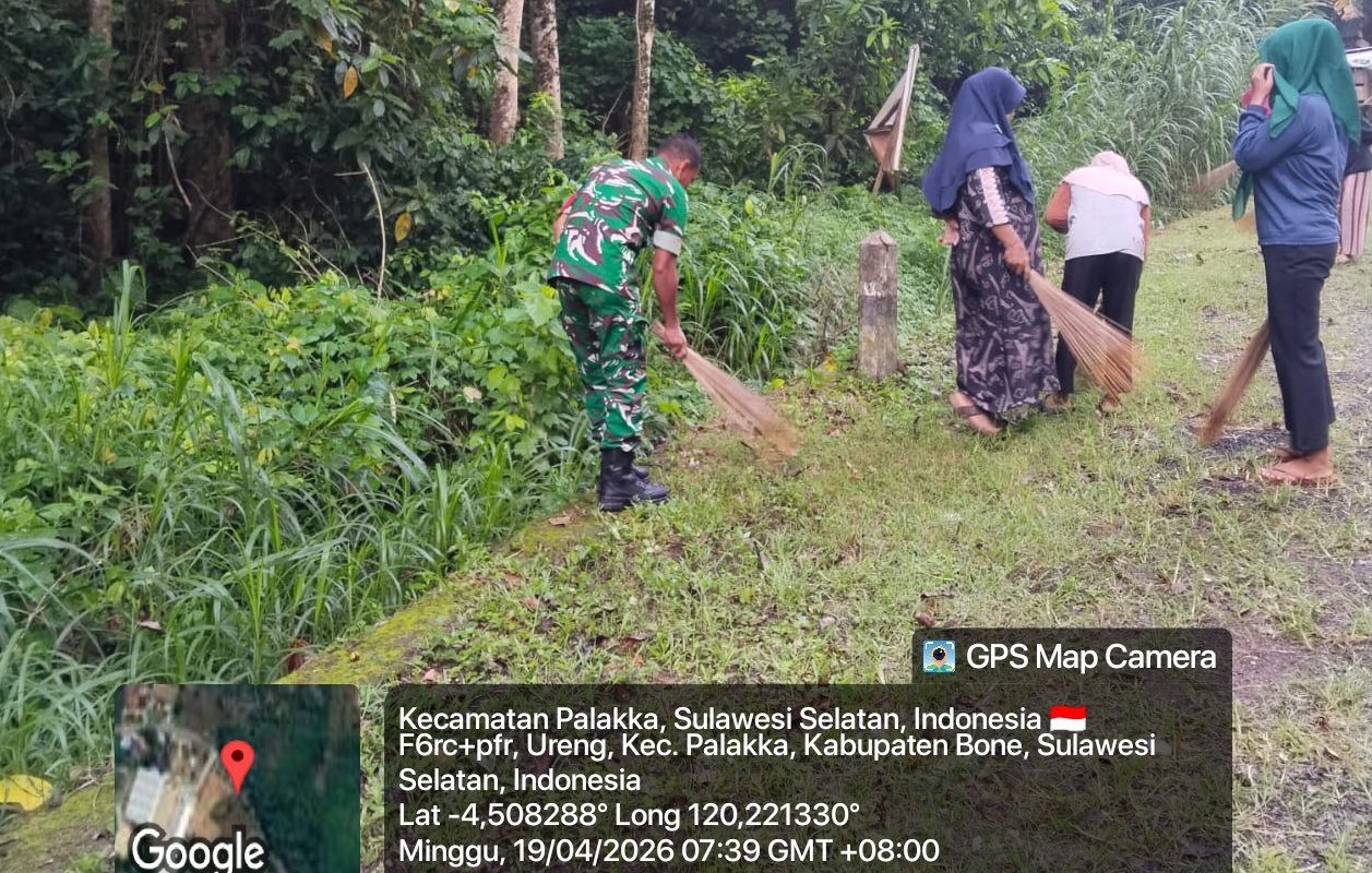 BONE – Babinsa Koramil 1407-21/Palakka Koptu Ahmad Amir bersama warga melaksanakan kerja bakti pembersihan sepanjang jalan poros di Desa Ureng, Kecamatan Palakka, Kabupaten Bone. Minggu siang (19/04/26).