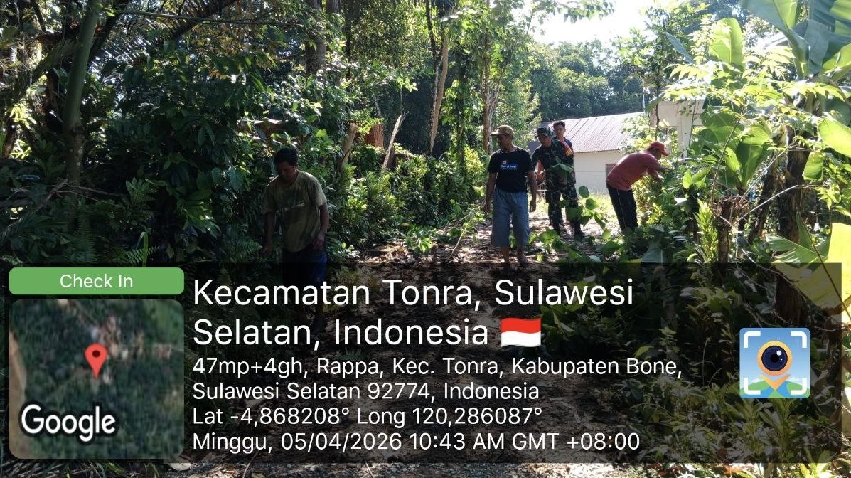 BONE – Babinsa Koramil 1407-16/Tonra, Serda Suardi, melaksanakan gotong royong bersama warga binaan dalam pembersihan jalan tani yang bertempat di Dusun Jaka, Desa Libureng, Kecamatan Tonra, Kabupaten Bone. Minggu siang (05/04/26).