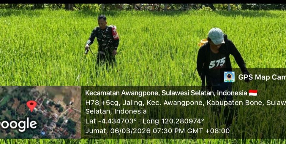 Bone – Sertu Ervan Babinsa Koramil 1407-06/Awangpone melaksanakan pendampingan kepada petani dalam penyemprotan hama pada tanaman padi di Desa Jaling, Kecamatan Awangpone, Kabupaten Bone, Jumat siang (06/03/26).