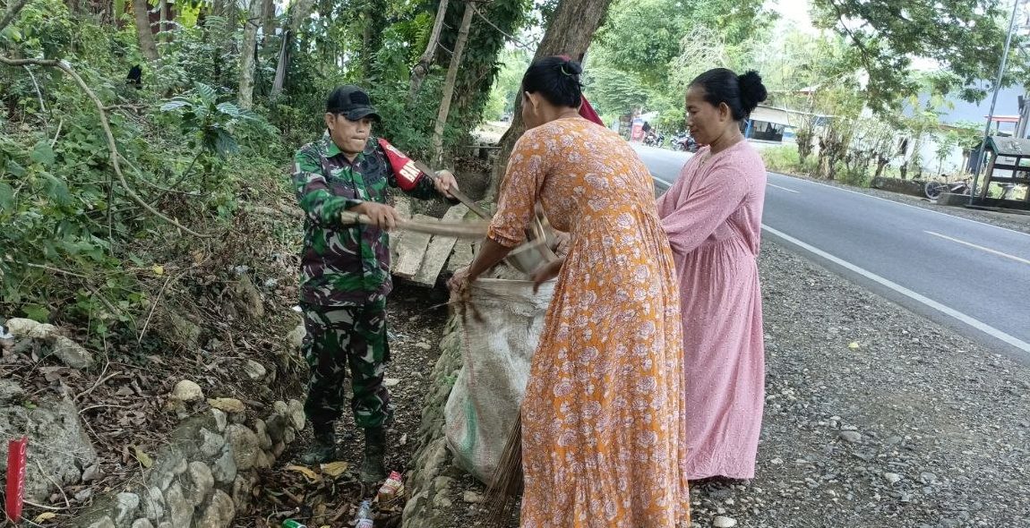 Dalam pelaksanaannya, Babinsa bersama warga bahu-membahu membersihkan sampah dan lumpur yang menyumbat saluran air.